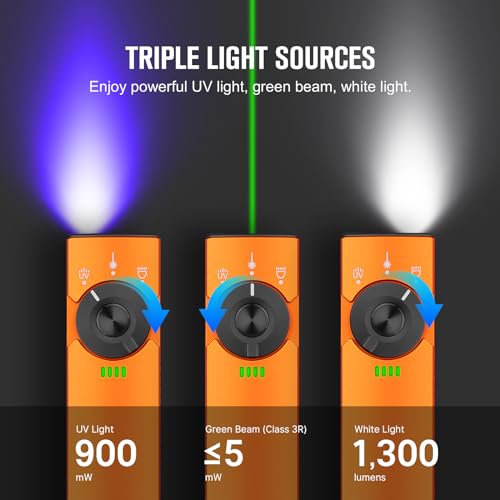 [Three-in-One Functionality] Provides an impressive maximum brightness of 1300 lumens for excellent illumination. Arkfeld pro combines white light, UV, and green beam in a single flashlight, offering versatility for a wide range of applications