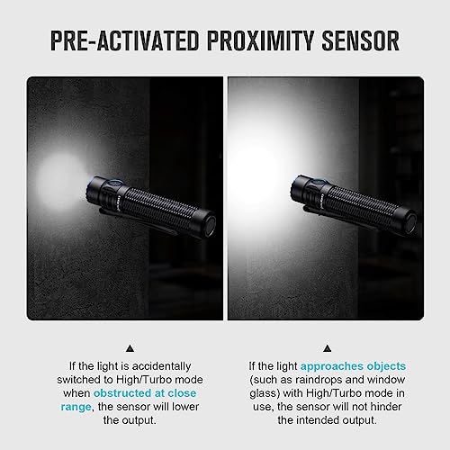 [𝗣𝗿𝗲-𝗮𝗰𝘁𝗶𝘃𝗮𝘁𝗲𝗱 𝗣𝗿𝗼𝘅𝗶𝗺𝗶𝘁𝘆 𝗦𝗲𝗻𝘀𝗼𝗿] If the flashlight is accidentally switched to high/turbo mode when obstructed at close range, the sensor will lower the output. However, if the light approaches objects with high/turbo mode in use, the sensor will not hinder the intended output