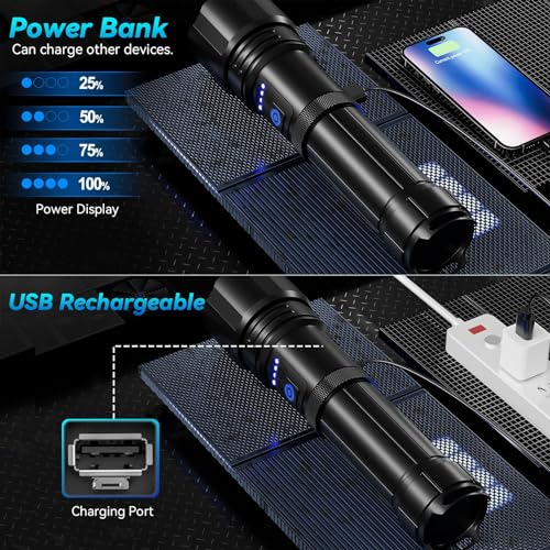 USB RECHARGEABLE & POWER BANK. Rechargeable flashlight equipped with large capacity rechargeable ΒATTERY, It can be continuously illuminated for 12 hours when fully charged. Also has a power output function, so you can use it as a mobile power supply to charge your device through the cable. In addition, the led flashlight power display light lets you know the power status of the handheld flashlights in real time.