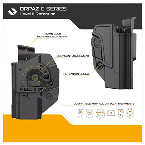 𝗠𝗼𝗱𝘂𝗹𝗮𝗿 𝗮𝗻𝗱 𝗖𝘂𝘀𝘁𝗼𝗺𝗶𝘇𝗮𝗯𝗹𝗲: Fully adjustable cant and retention. Compatible with all Orpaz attachments for belt, paddle, low-ride, drop-leg, or MOLLE. Fits common pistol accessories like sights and scopes.