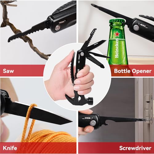 Multitool hammer – Our 12-IN-1 TOOL multitool hammer comes equipped with a variety of useful tools, including a hammer, pliers, a serrated knife, a saw, wire cutters, a prying claw, a nail file, a bottle opener, and both flat and Phillips head screwdrivers and durable nylon carrying case with belt holster. Great for your car, boat, office, and trips.
