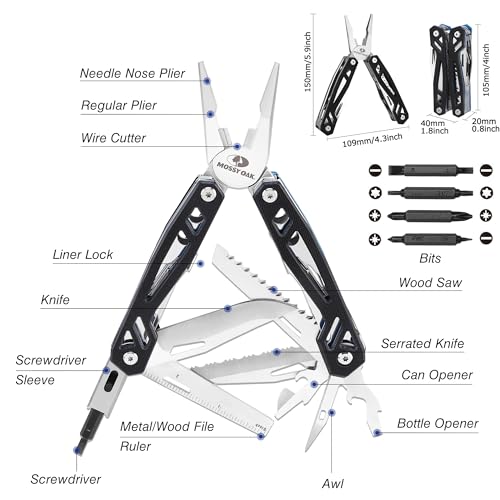 21-in-1 Function – The multi tool includes needle nose pliers, regular pliers, wire cutters, magnetic hexagon sleeve, screwdriver, knife, scale, metal/wood File, serrated knife, bottle opener & slotted screwdriver, wood saw, leather punch, 8-in-1 bit set and more