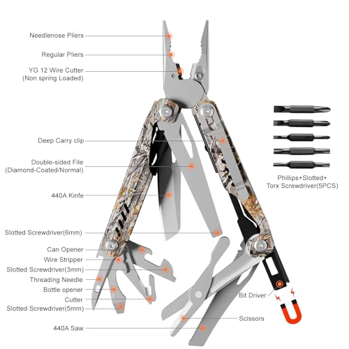 【26-IN-1 MULTI-TOOLS】Our multitool includes 26 tools: needle-nose & regular pliers, YG12 wire cutter, knife, saw, diamond-coated and metal file, scissors, flat screwdriver (3,5,6mm), bottle & can openers, rope cutter, wire stripper, threading needle, pocket clip, and it also comes 10-in-1 bit set as freebie, you can carry up your widely used one when you’re outing.